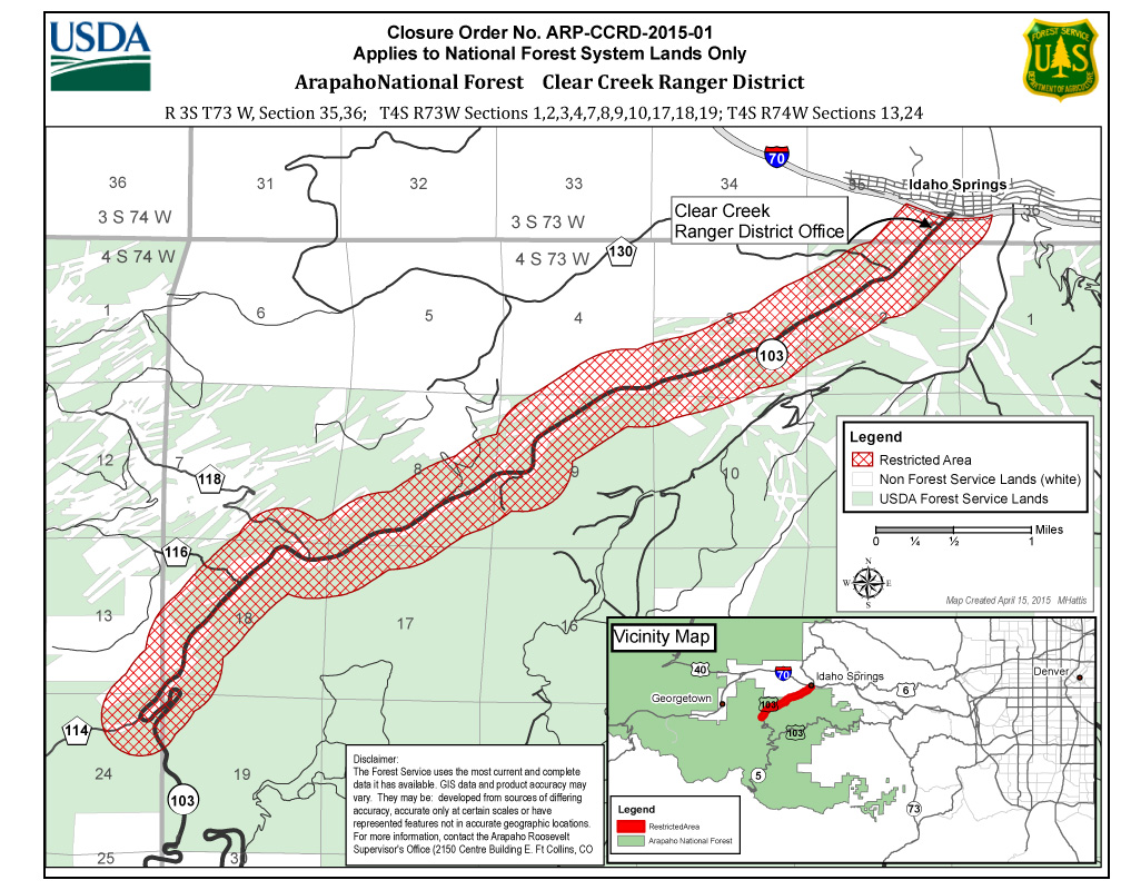 IDAHO SPRINGS, Colo.– To improve public safety and protect national resources, the U.S. Forest Service has closed National Forest System lands along a portion of Colo. Highway 103 to camping, campfires and other overnight uses. The closure applies to areas on the Arapaho National Forest within a quarter mile of Highway 103 between Idaho Springs and County Road 114.