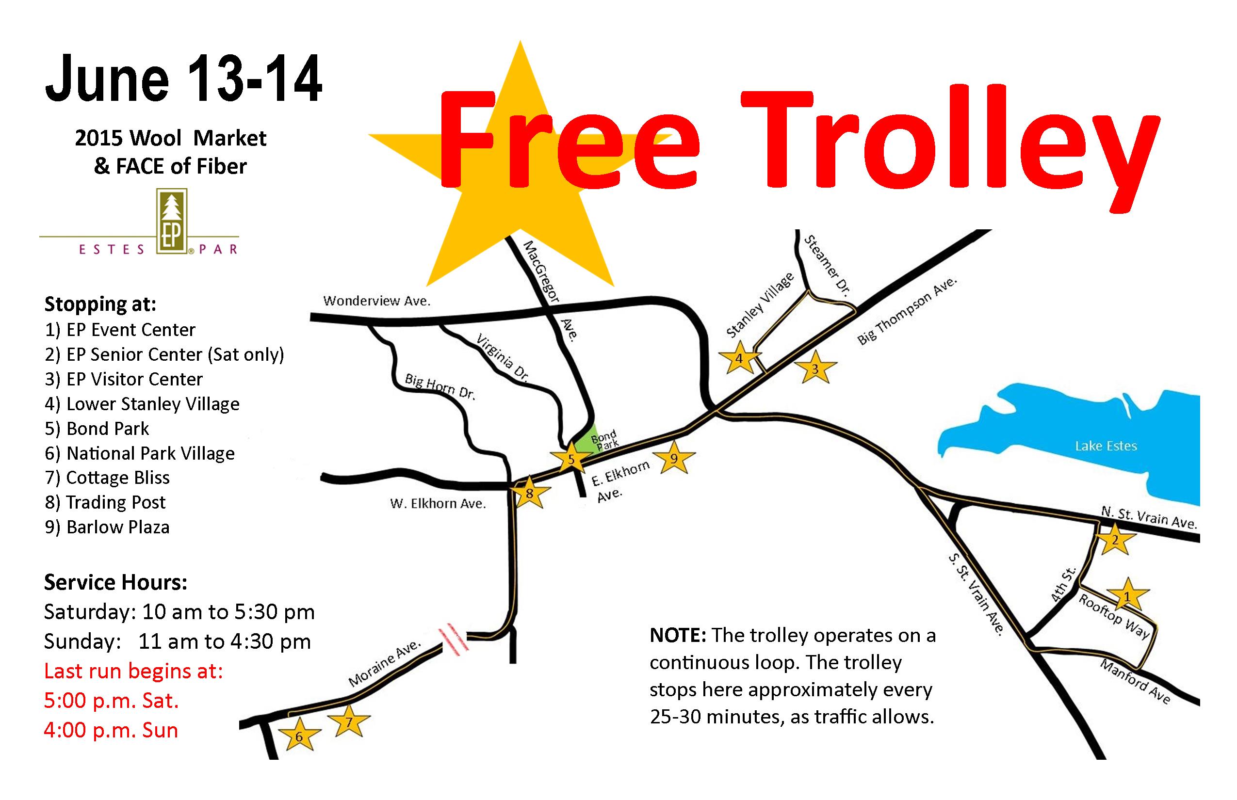 The Elkhorn Express Free trolley serves stops beginning at 1) Estes Park Event Center, 2) Estes Park Senior Center (on Saturday only), 3) Estes Park Visitor Center, 4) Lower Stanley Village, 5) Bond Park, 6) National Park Village, 7) Cottage Bliss, 8) Trading Post, and 9) Barlow Plaza