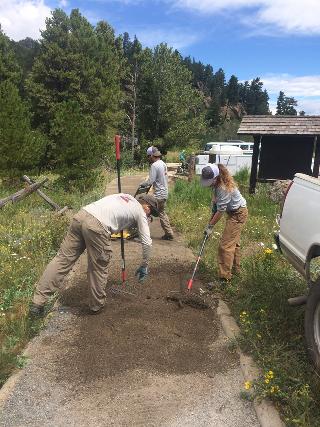 Within Rocky Mountain National Park, the Estes Crew maintained 112 miles of trail to ensure safe and sustainable public access. As the season progressed, they began working on flood recovery projects. This included restoring the tread on the Cow Creek Trail which was significantly eroded during the September 2013 floods and resurfacing one of the accessible trails around Lily Lake to allow access to the area for all visitors. In addition, the crew planted more than 4500 native plants in a disturbed area and spent several days working to remove non-native plant species from RMNP.
