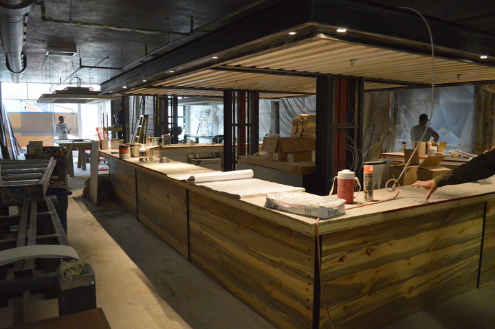 The bar in Westbound & Down Brewing Company, under construction in October, features beetle-kill pine and stone top.